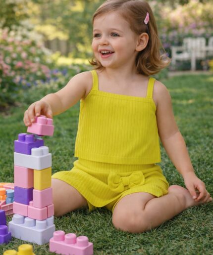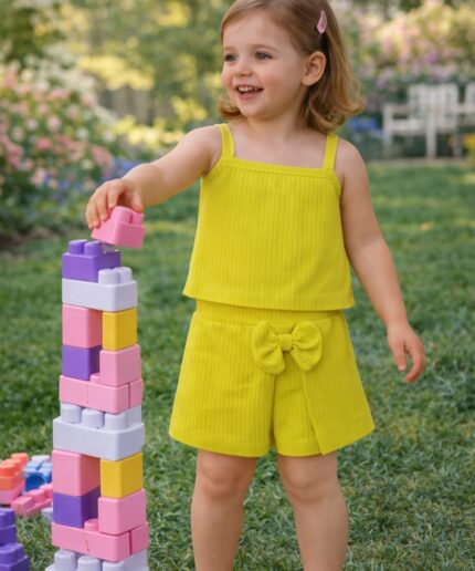 Conjunto infantil na cor verde limão, confeccionado em canelado de algodão, proporcionando conforto, elasticidade e um caimento ajustado ao corpo.