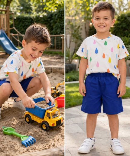 O short saia possui elástico largo costurado na cintura, garantindo liberdade de movimento e praticidade para brincar.