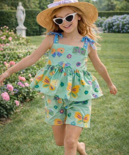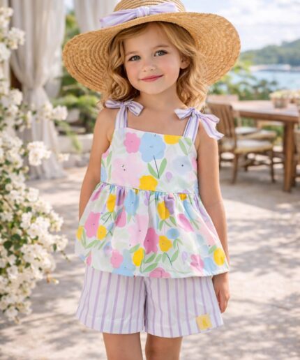 Conjunto infantil confeccionado em malha crepe, com estampa digital de cores vivas e vibrantes, oferecendo um visual alegre e moderno.