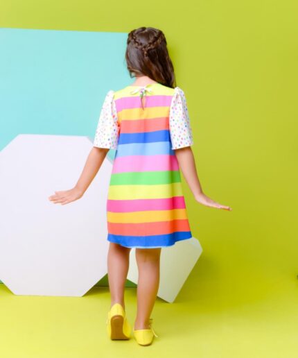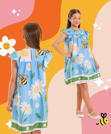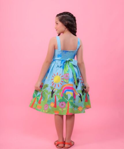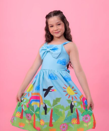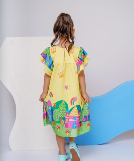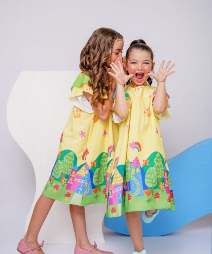 Vestido infantil confeccionado em crepe alfaiataria com toque de seda e estampa digital lúdica, com cores vivas e vibrantes que não desbotam, garantindo um visual alegre e encantador.