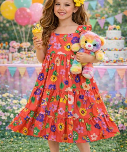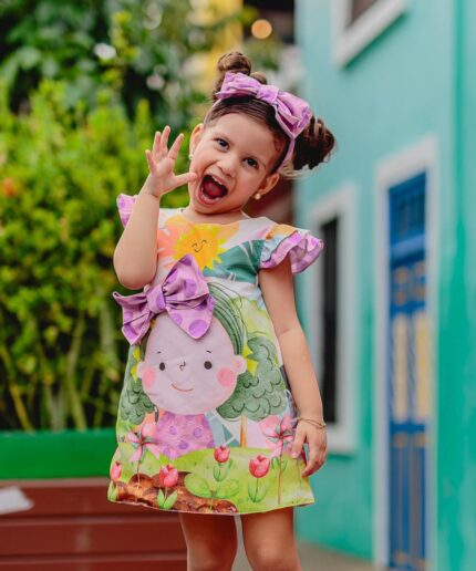 Vestido infantil confeccionado em viscose, tecido leve, fresco e confortável, ideal para dias mais quentes.