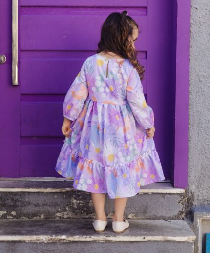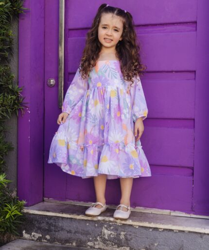 Vestido infantil confeccionado em crepe alfaiataria com toque de seda e estampa digital, trazendo leveza, sofisticação e um caimento impecável.
