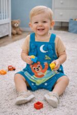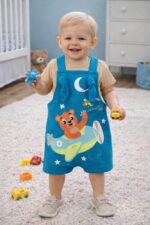 O macacão é confeccionado em algodão estampado, com alças de ajuste de altura, proporcionando melhor adaptação ao corpo.