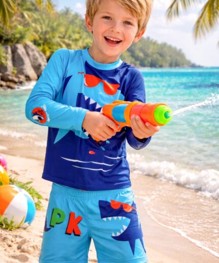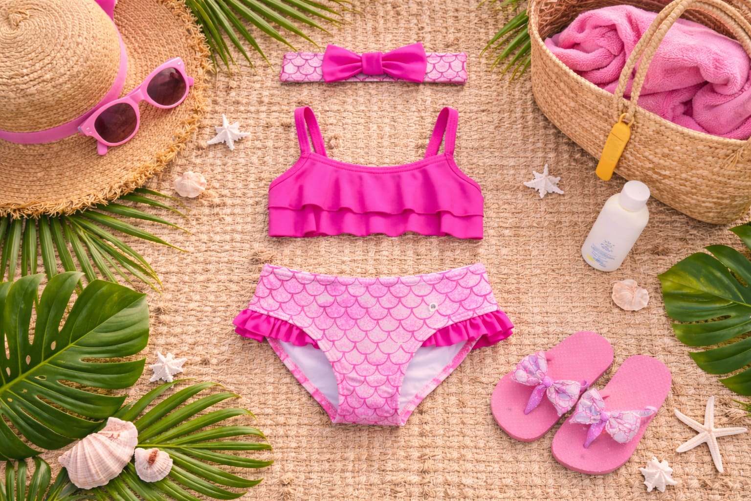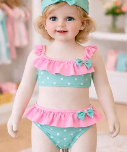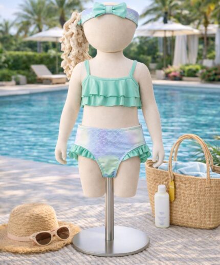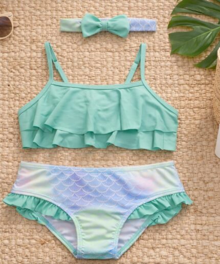 A parte de cima possui babadinho triplo, trazendo volume e um visual delicado. A calcinha conta com estampa que simula escaminhas, com acabamento em babadinho suave na perna, deixando a peça ainda mais charmosa.