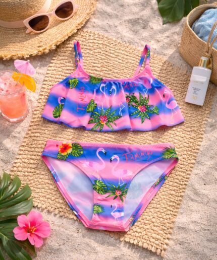 A parte de cima possui babadinho e aplicação de strass, trazendo volume e um visual delicado. A calcinha conta com estampa de Flamingo, deixando a peça ainda mais charmosa.