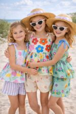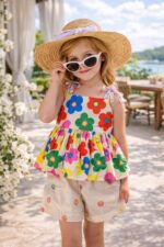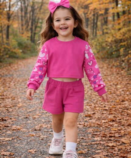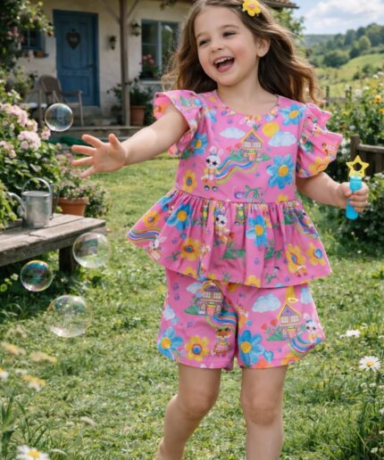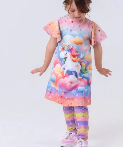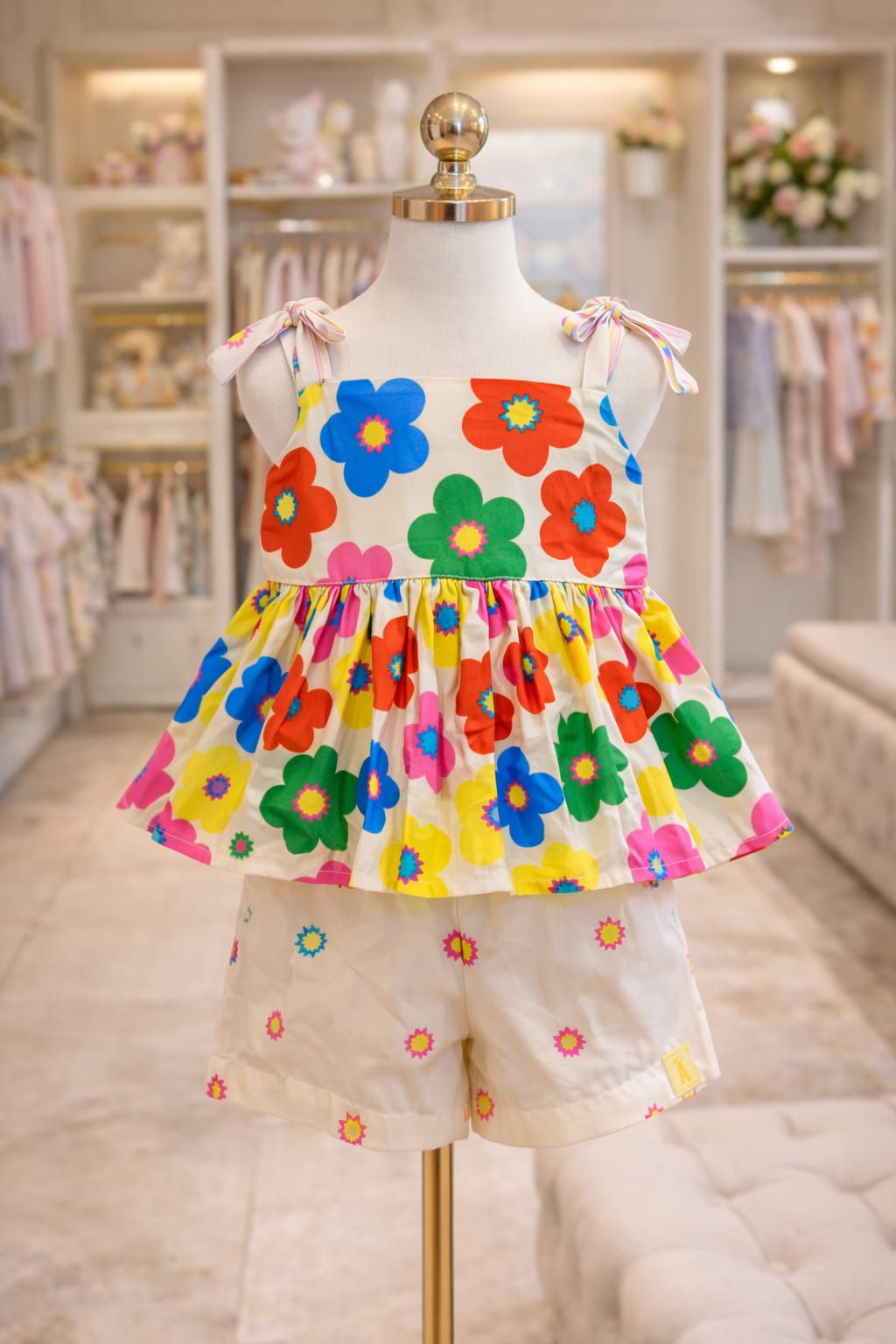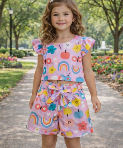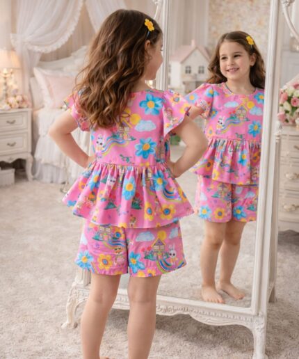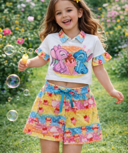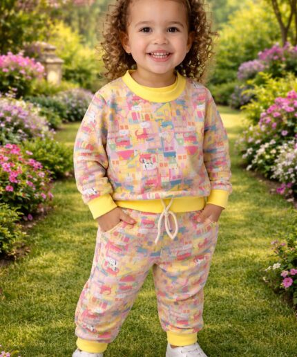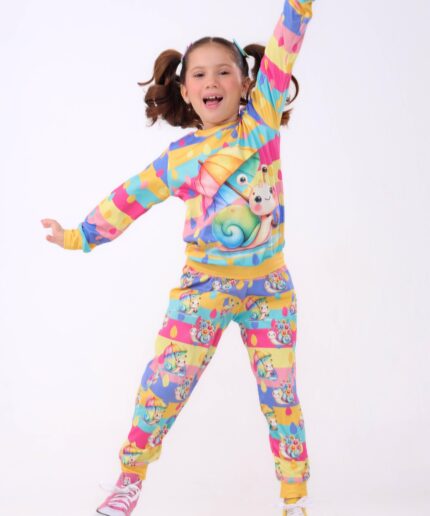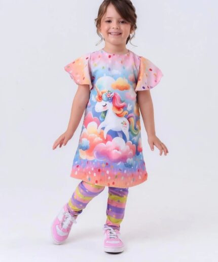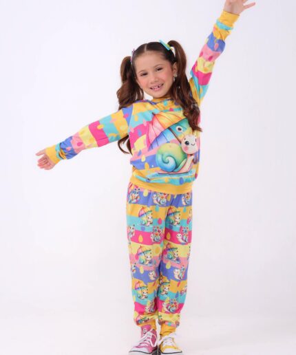 Conjunto infantil confeccionado em crepe alfaiataria com toque de seda e estampa digital.