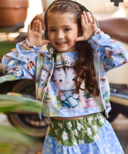 Conjunto infantil confeccionado em crepe alfaiataria com toque de seda e estampa digital.