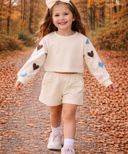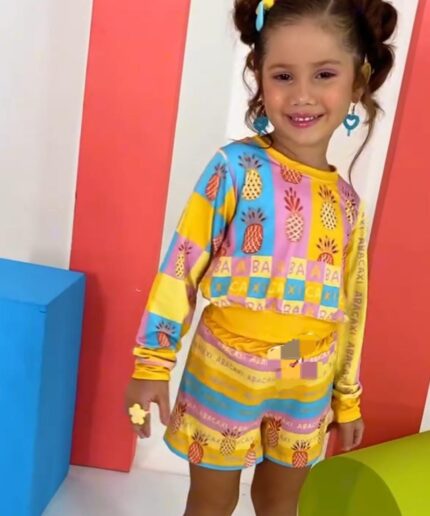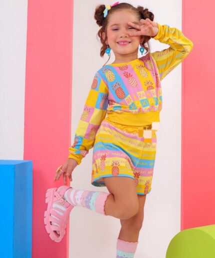 O conjunto é composto por cropped de manga curta e short saia, trazendo um look moderno, confortável e cheio de estilo para as pequenas.