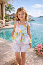 O conjunto é composto por cropped e shorts, com modelagem confortável que permite liberdade de movimento. Possui cores vibrantes, com estampa que não desbota, mantendo a beleza da peça mesmo após as lavagens.