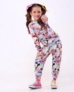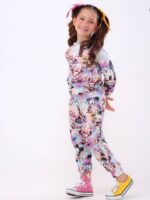 Conjunto infantil confeccionado em malha crepe, com estampa digital de cores vivas e vibrantes, oferecendo um visual alegre e moderno.
