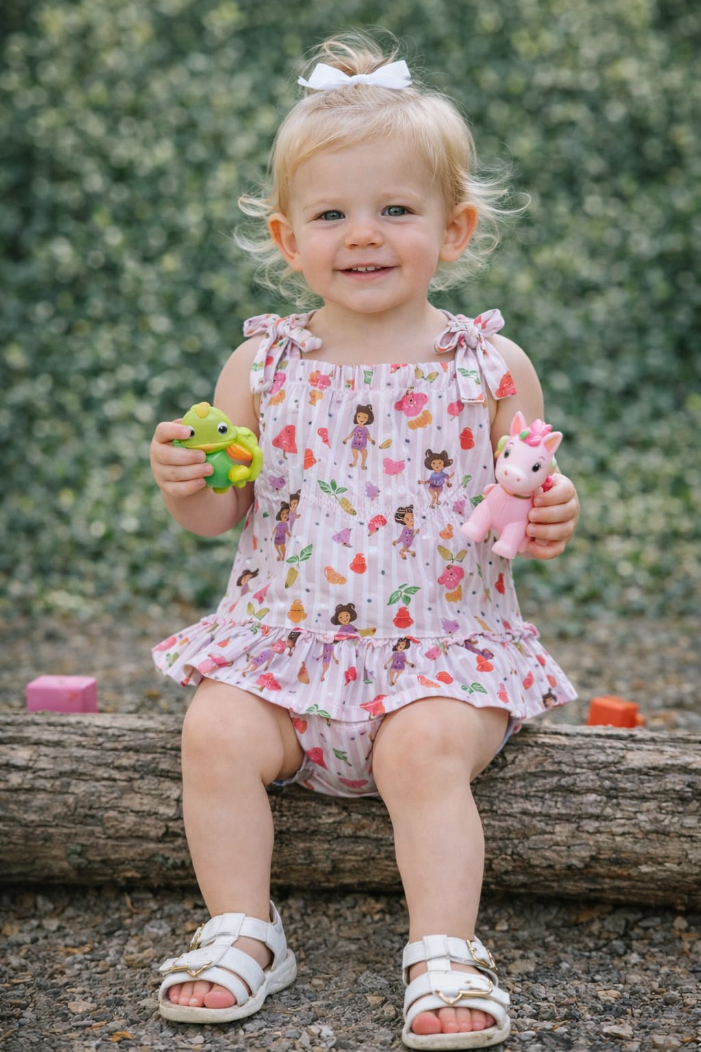 Romper infantil confeccionado em tecido leve e confortável, modelo soltinho e delicado, com franzido na parte do peito para um caimento suave. O ajuste de altura é feito por laço nas costas, permitindo regular conforme o tamanho da bebê. A peça possui elástico nas perninhas com babadinho franzido, ficando bem próximo da fralda, deixando o visual ainda mais fofo. Acompanha faixinha de cabelo combinando com a estampa. ✨ Tamanho: 1 ano ✨ Detalhes: franzido no peito + ajuste por laço nas costas ✨ Perninha: elástico com babadinho delicado ✨ Acompanha: faixinha de cabelo
