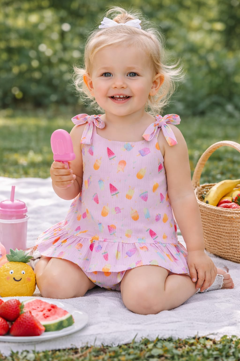 Romper infantil confeccionado em tecido leve e confortável, modelo soltinho e delicado, com franzido na parte do peito para um caimento suave. O ajuste de altura é feito por laço nas costas, permitindo regular conforme o tamanho da bebê. A peça possui elástico nas perninhas com babadinho franzido, ficando bem próximo da fralda, deixando o visual ainda mais fofo. Acompanha faixinha de cabelo combinando com a estampa. ✨ Tamanho: 1 ano ✨ Detalhes: franzido no peito + ajuste por laço nas costas ✨ Perninha: elástico com babadinho delicado ✨ Acompanha: faixinha de cabelo
