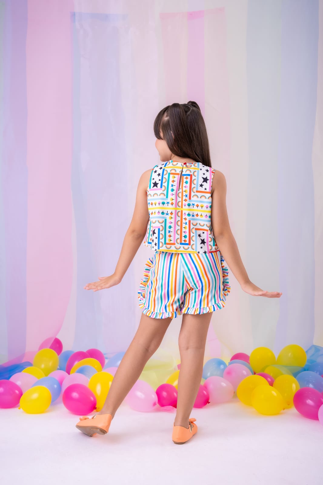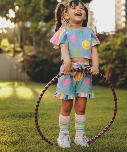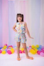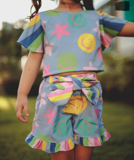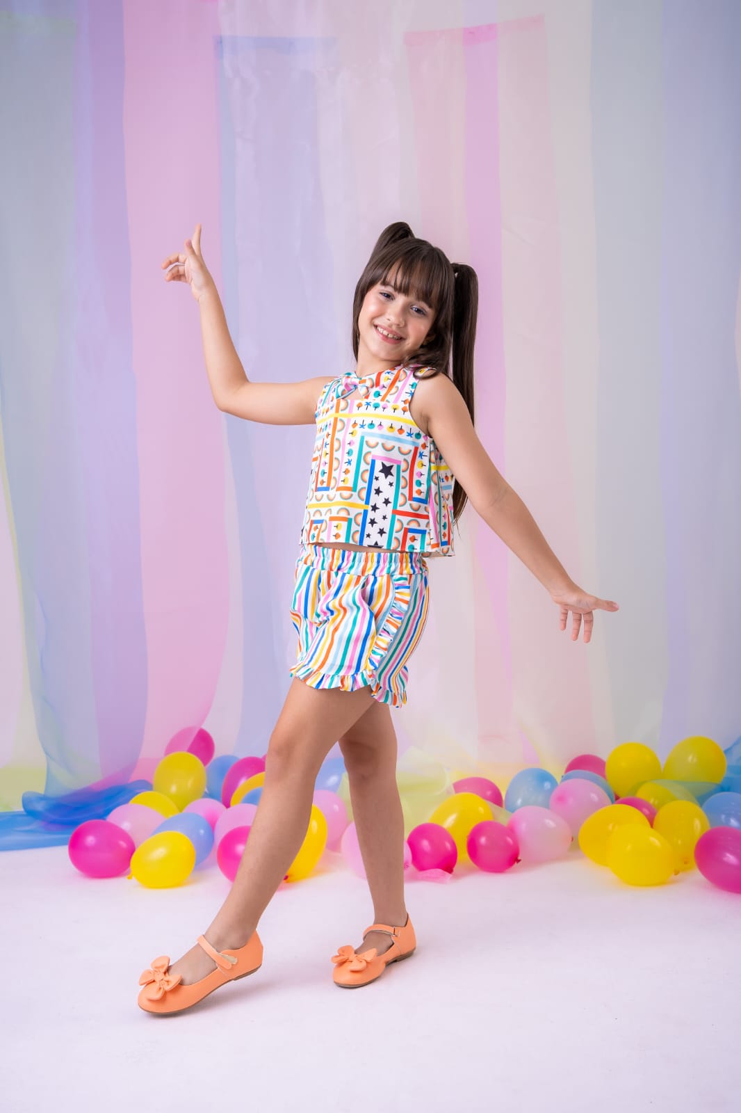 Conjunto infantil confeccionado em malha crepe, com estampa digital de cores vivas e vibrantes, oferecendo um visual alegre e moderno.