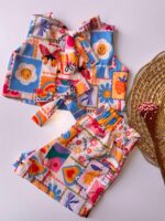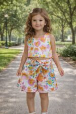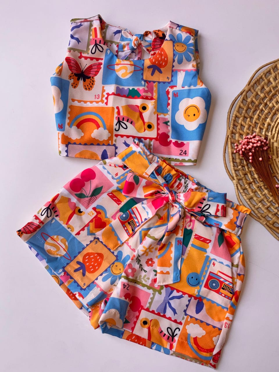 Conjunto infantil confeccionado em crepe com toque de seda, tecido leve, macio e confortável.