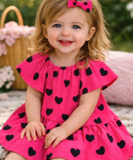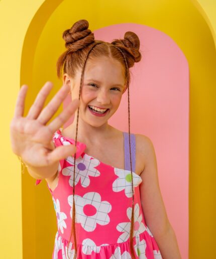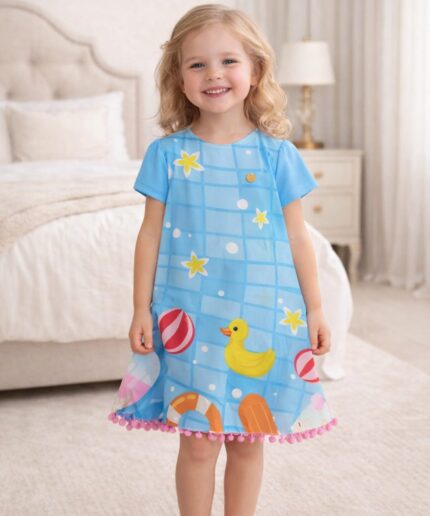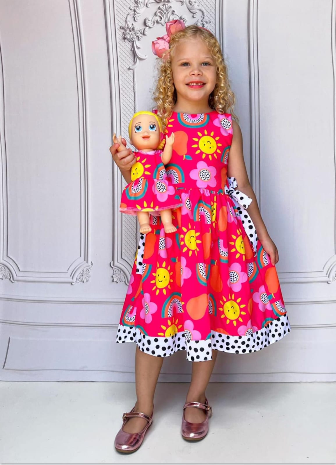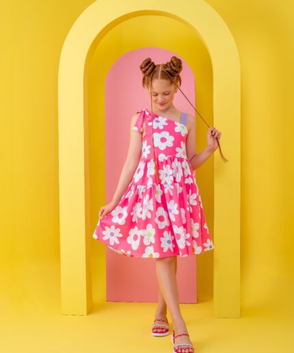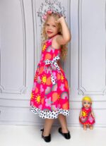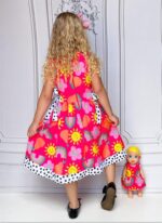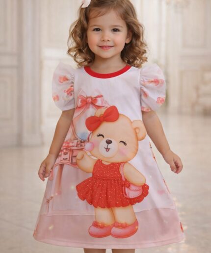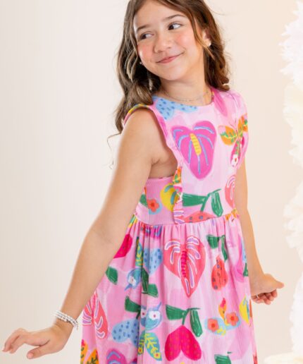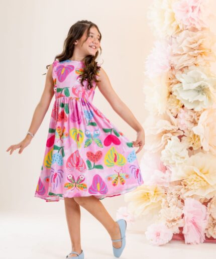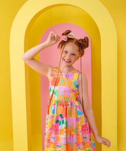 Vestido infantil confeccionado em crepe alfaiataria com toque de seda e estampa digital lúdica, com cores vivas e vibrantes que não desbotam, garantindo um visual alegre e encantador.