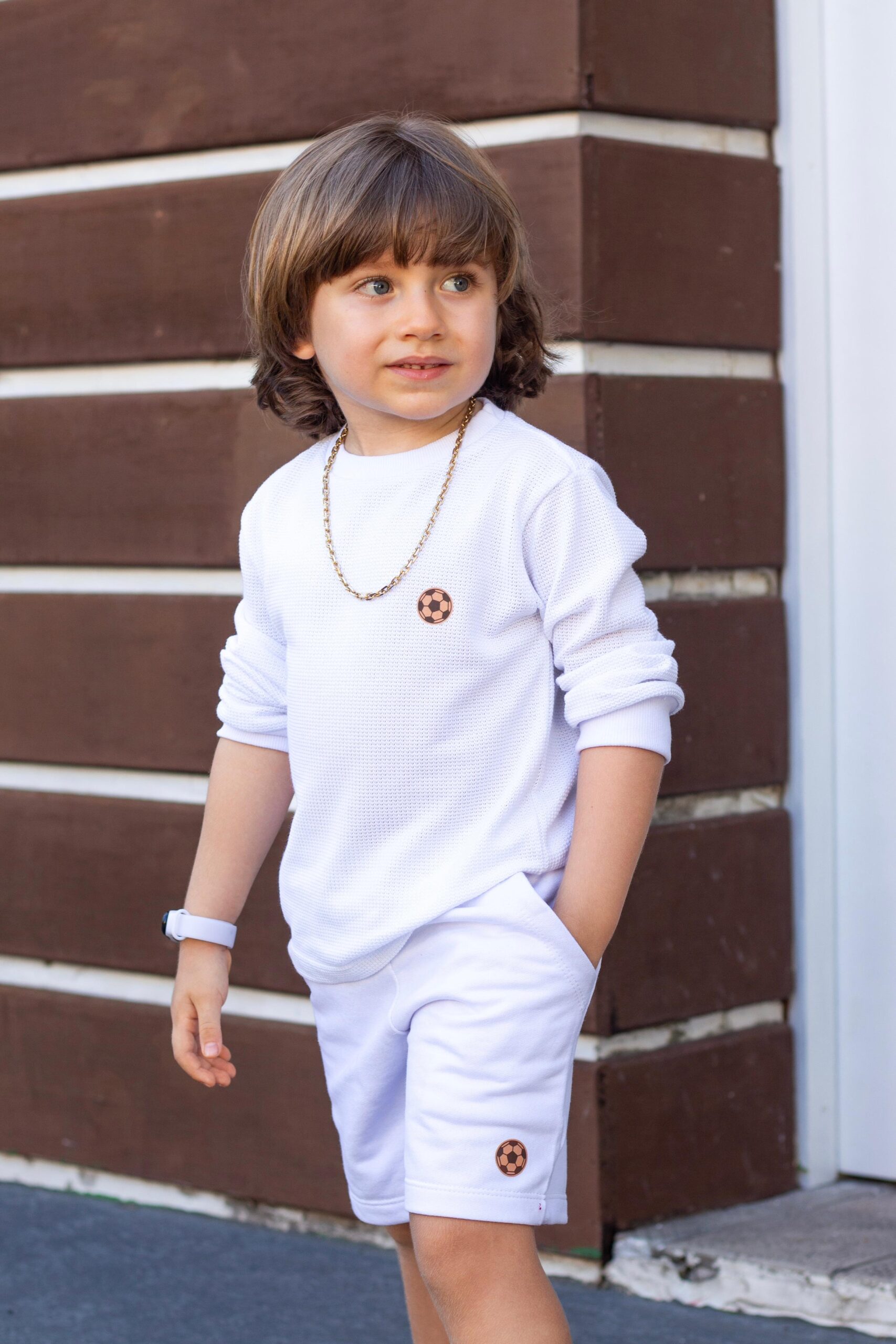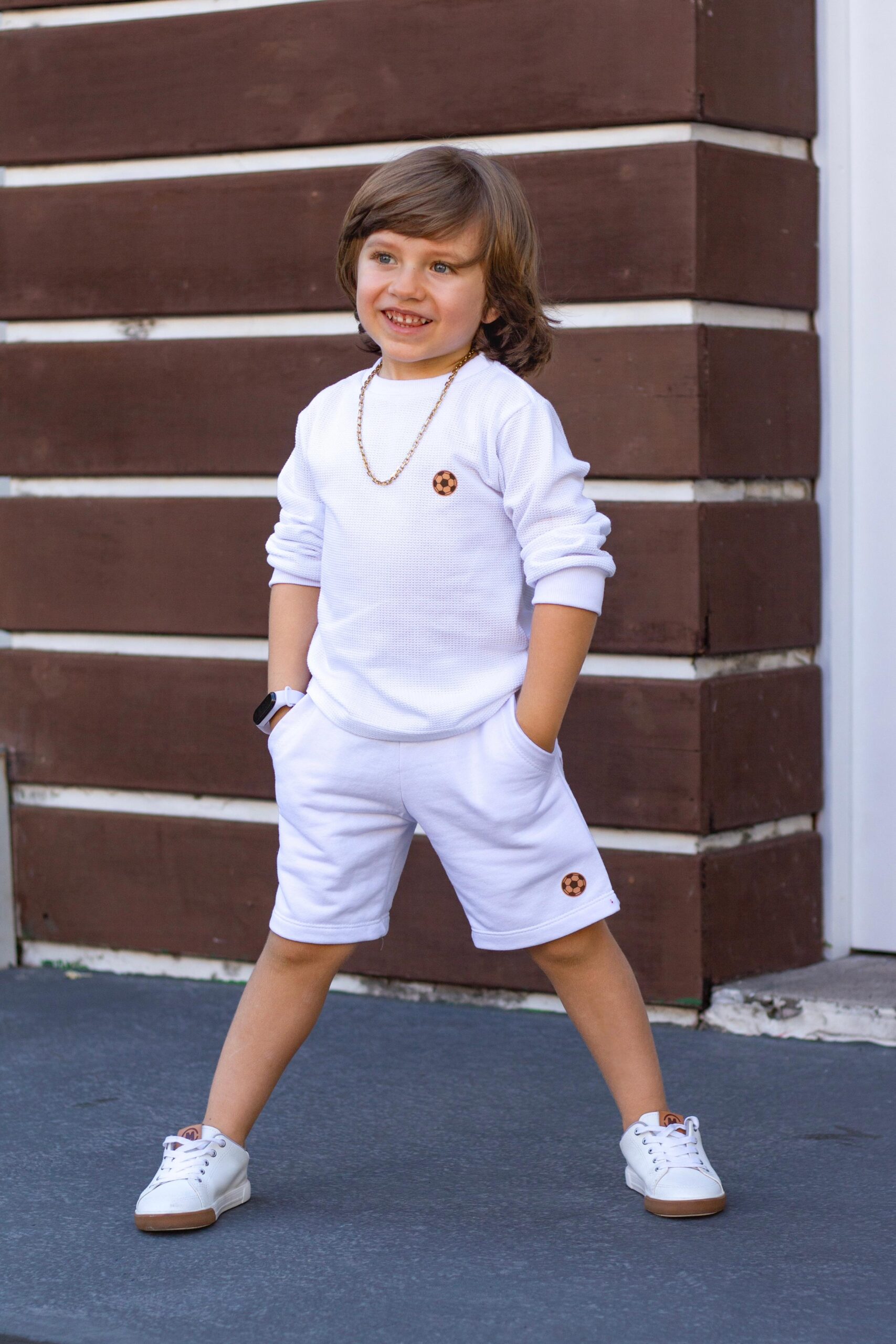 O shorts é confeccionado em moletinho de algodão de alta qualidade, com aplicação que acompanha o estilo da blusa. Conta com passador, elástico na cintura e cordão para ajuste.