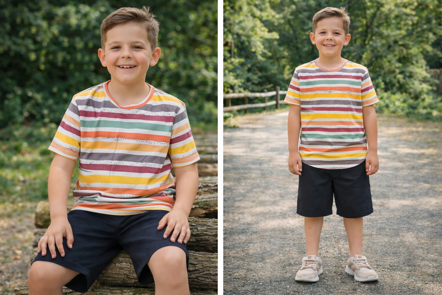Conjunto masculino estilo “Mauricinho”, composto por camiseta confeccionada em suedine com estampa digital e gola com costura rebatida.