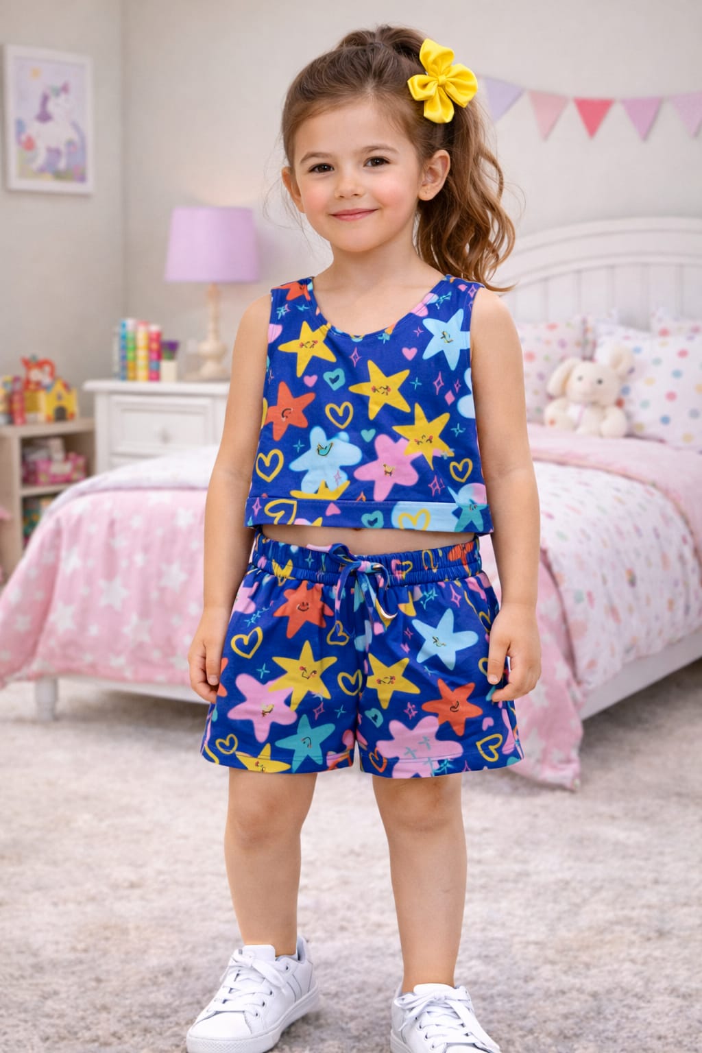 Conjunto infantil confeccionado em crepe alfaiataria com toque de seda e estampa digital, trazendo leveza, sofisticação e um caimento impecável.