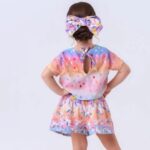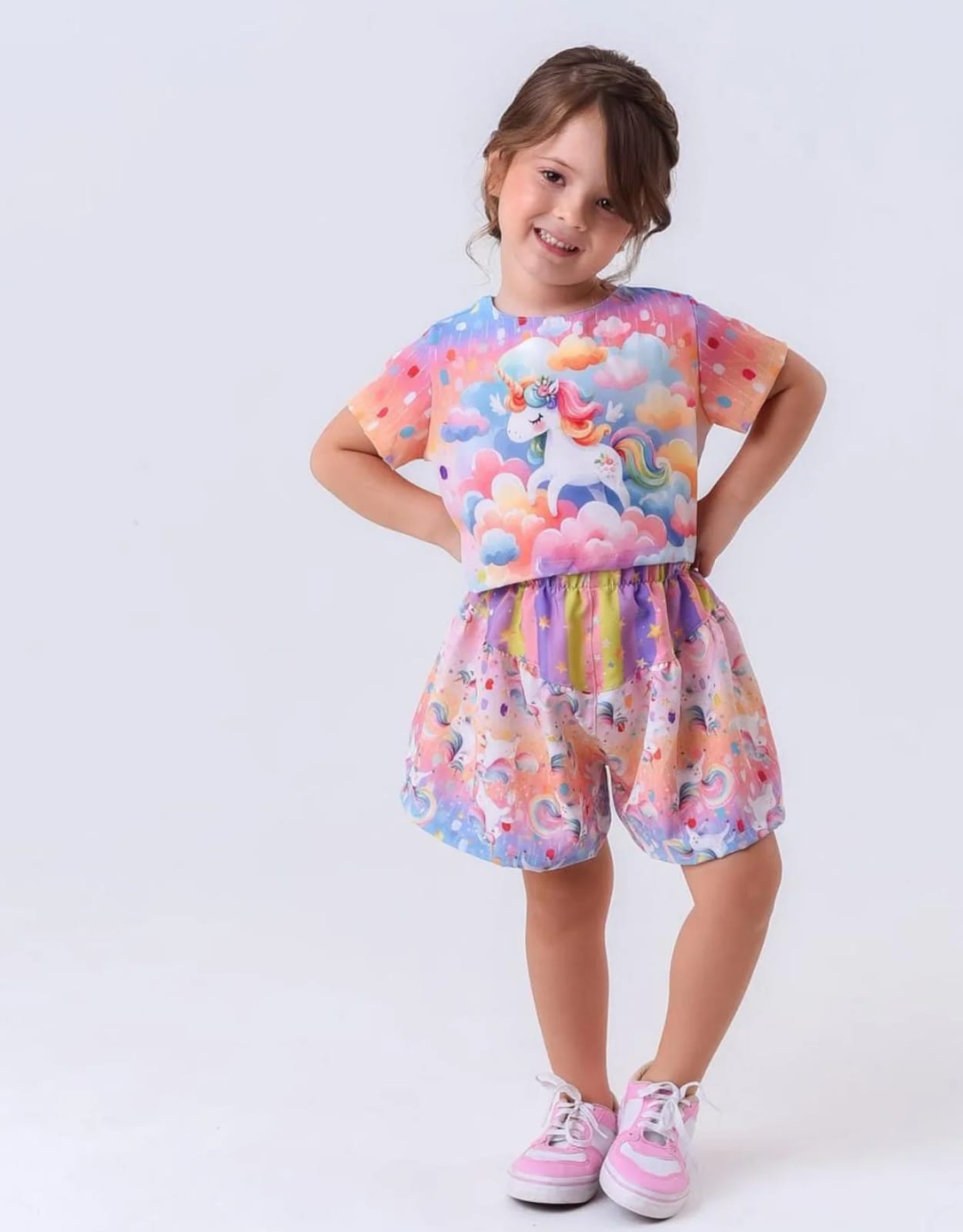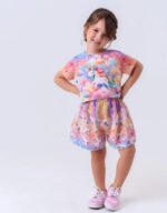 O conjunto é composto por cropped de manga curta e short saia, trazendo um look moderno, confortável e cheio de estilo para as pequenas.