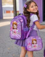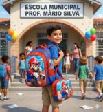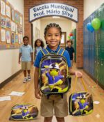 A lancheira é térmica, ideal para conservar alimentos, e acompanha estojo combinando no mesmo tema 3D, formando um kit completo para uso escolar.