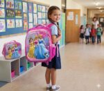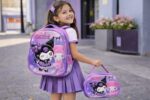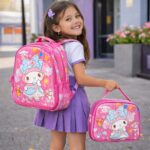Kit mochila infantil importado com design em 3D de personagem, composto por três peças coordenadas: mochila grande de costas, lancheira térmica e estojo escolar.