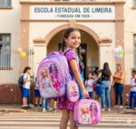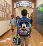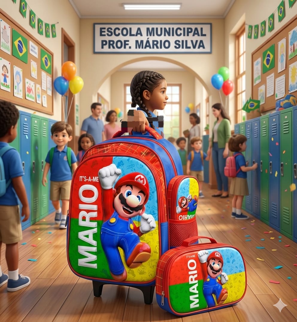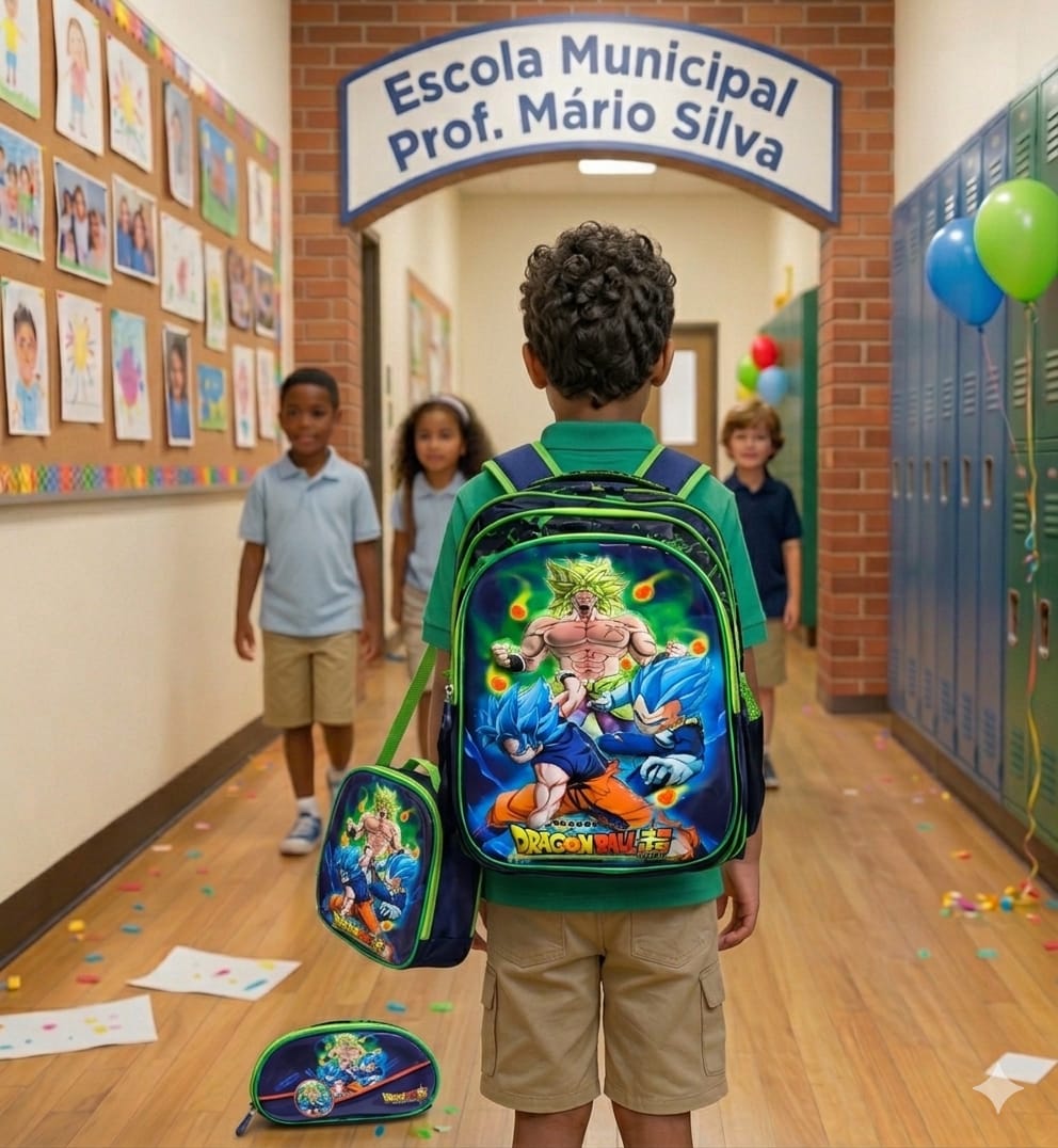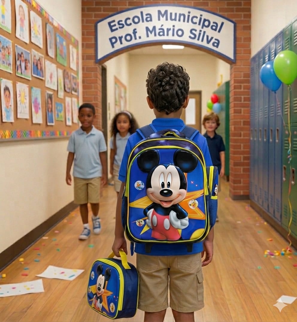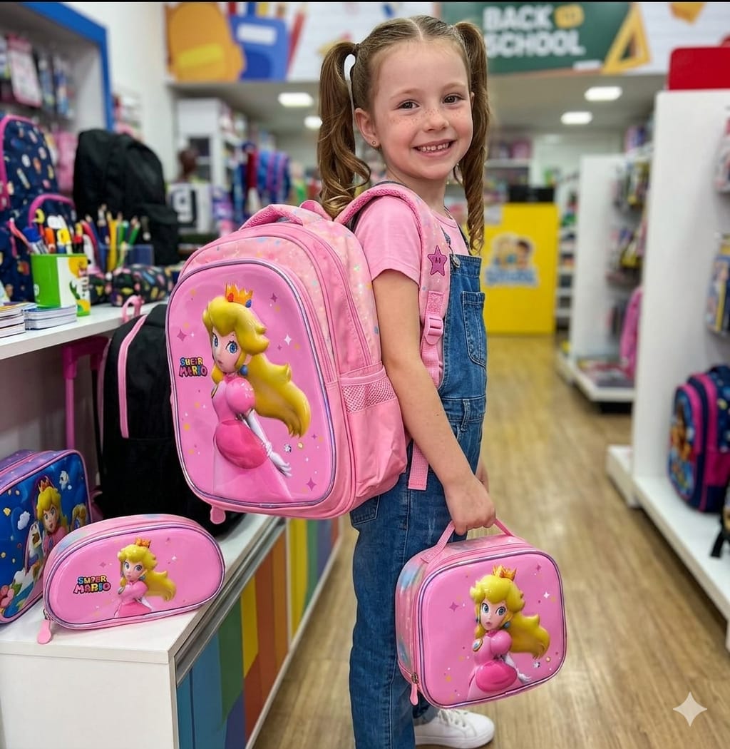 A mochila principal possui capa frontal rígida em alto relevo 3D, proporcionando maior durabilidade e destaque visual no ponto de venda. Conta com três divisórias amplas para organização escolar e dois bolsos laterais ideais para garrafinhas, sucos ou pequenos objetos.
