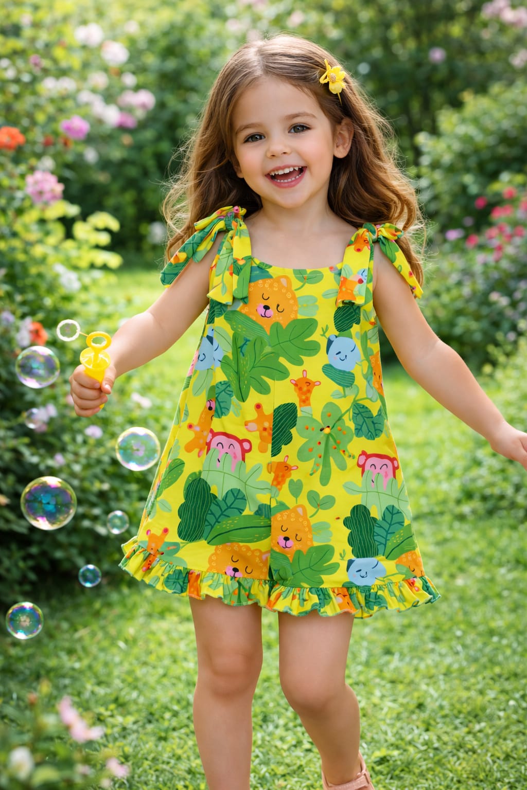 Macaquinho confeccionado em crepe com toque de seda, garantindo um caimento leve, fresco e extremamente confortável para o dia a dia das pequenas.