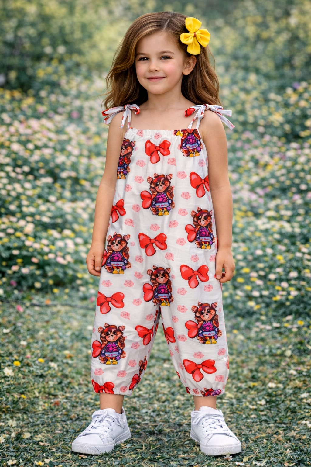 Macacão infantil modelo saruel, com comprimento mais curto nas pernas e elástico na barra, proporcionando conforto e liberdade de movimento.