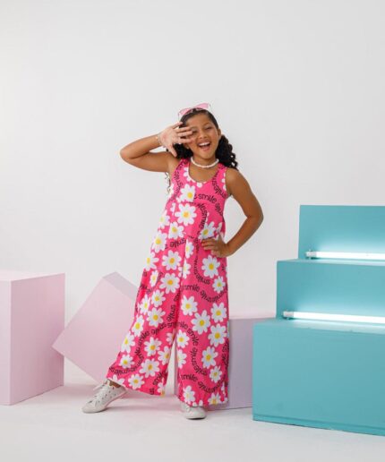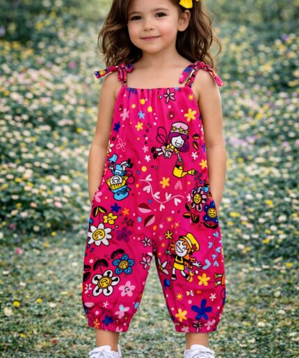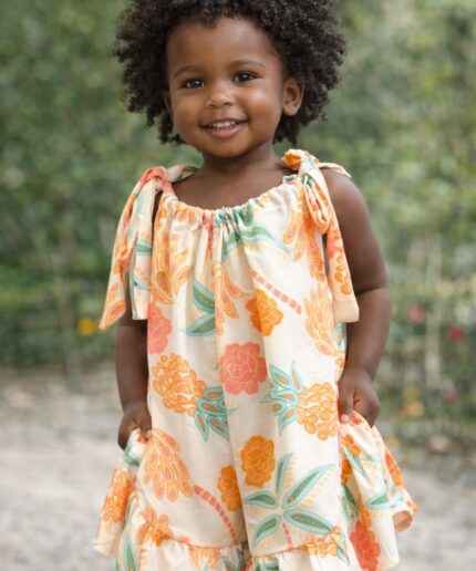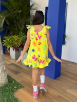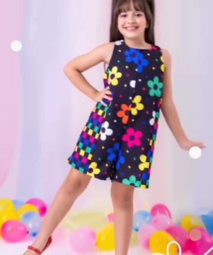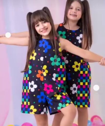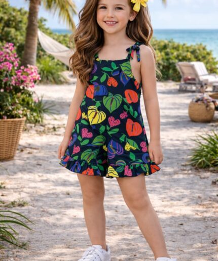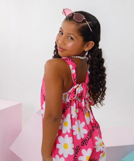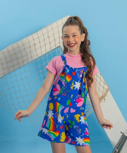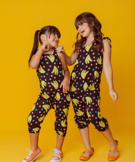 Macaquinho confeccionado em crepe com toque de seda, garantindo um caimento leve, fresco e extremamente confortável para o dia a dia das pequenas.