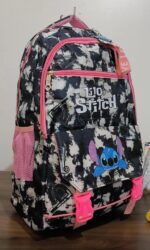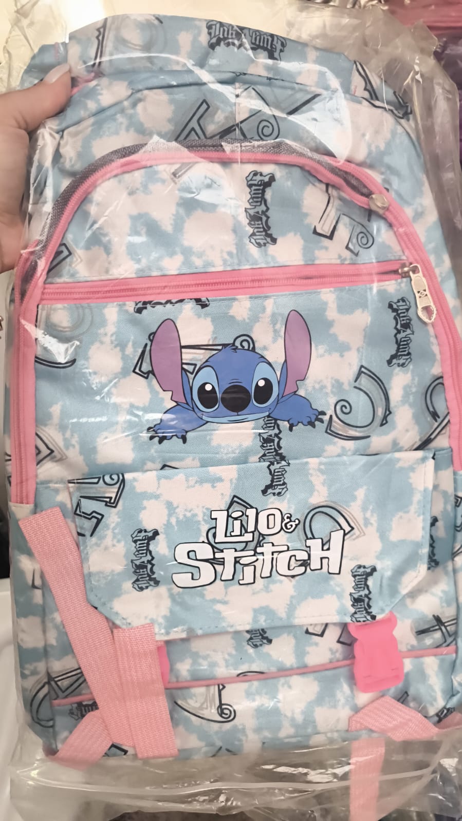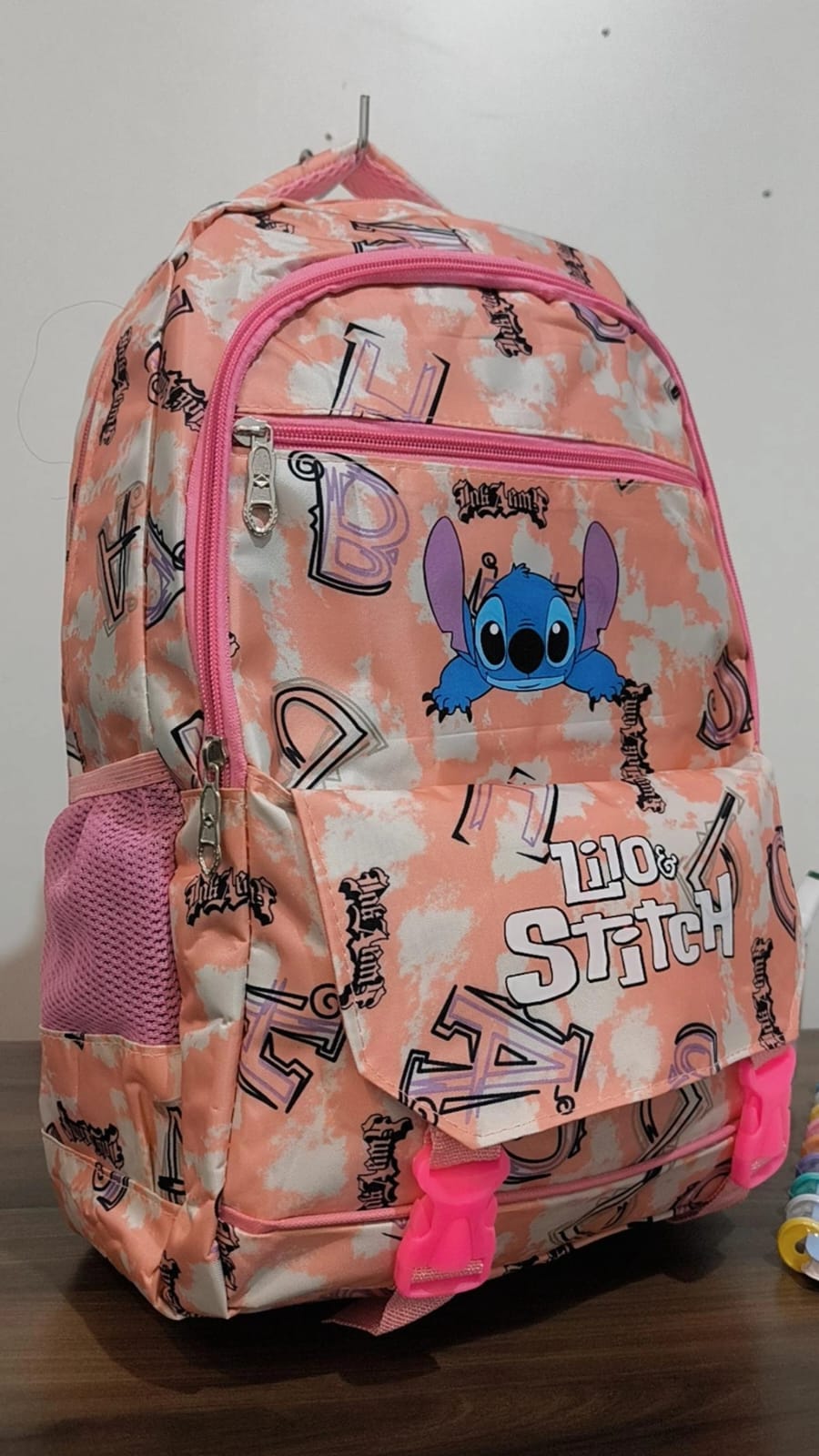 Mochila infantil de costas com estampa temática Stitch, confeccionada em material sintético com base em poliéster reforçado, leve e resistente para uso escolar diário.