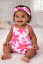 Romper infantil confeccionado em tecido leve e confortável, modelo soltinho e delicado, com franzido na parte do peito para um caimento suave.