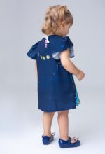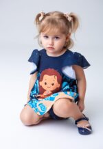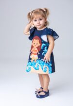 Vestido infantil confeccionado em crepe alfaiataria premium com estampa digital e leve elasticidade (3%), proporcionando conforto e bom caimento.