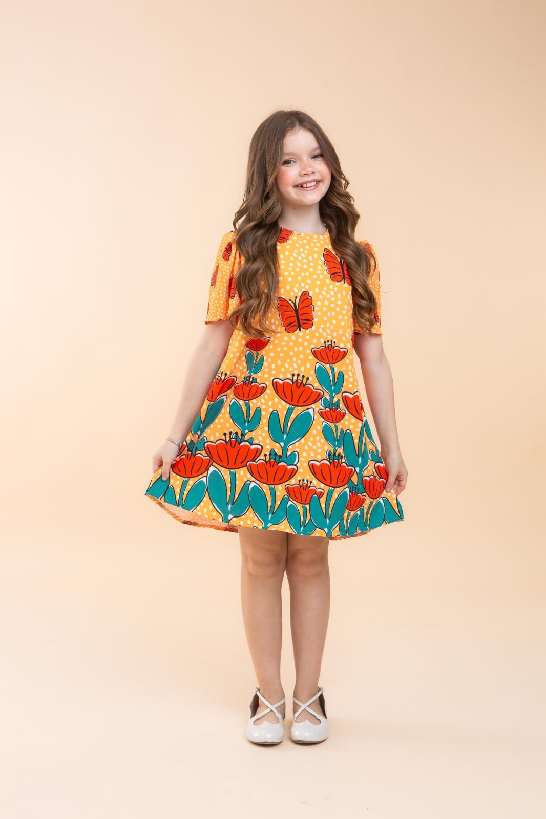 Vestido infantil confeccionado em crepe toque de seda, com estampa digital de cores vivas e vibrantes, tecido leve e confortável, ideal para o dia a dia das pequenas.