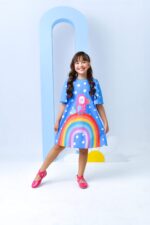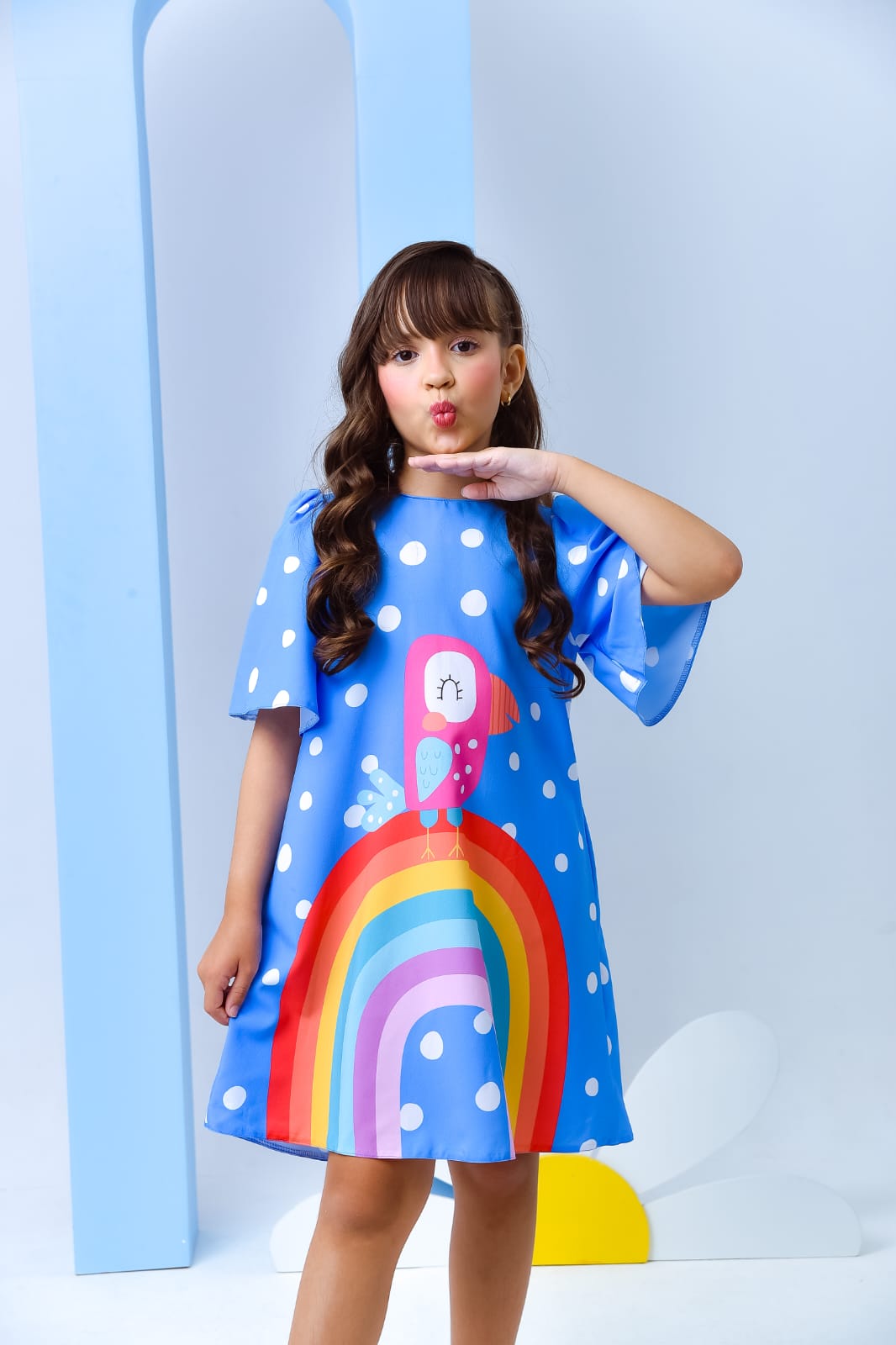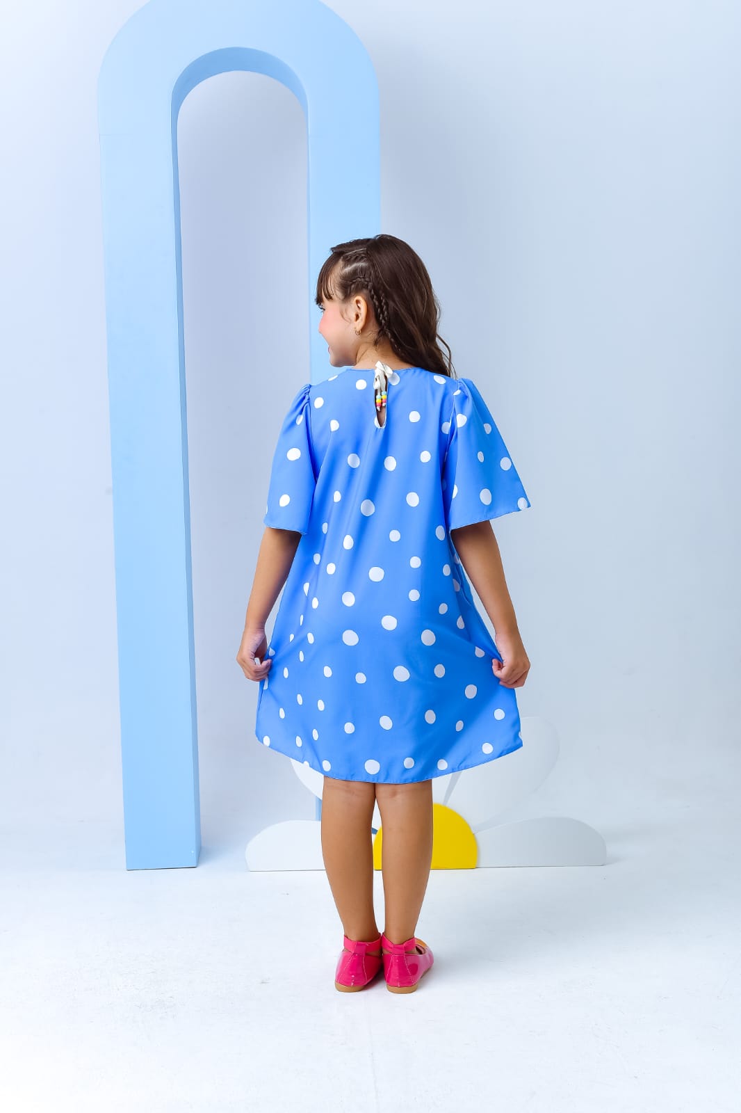 Vestido infantil com modelagem rodadinha e estampa lúdica vibrante, ideal para compor looks alegres e cheios de personalidade.