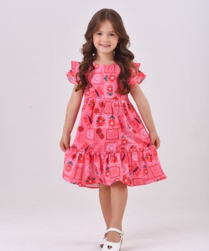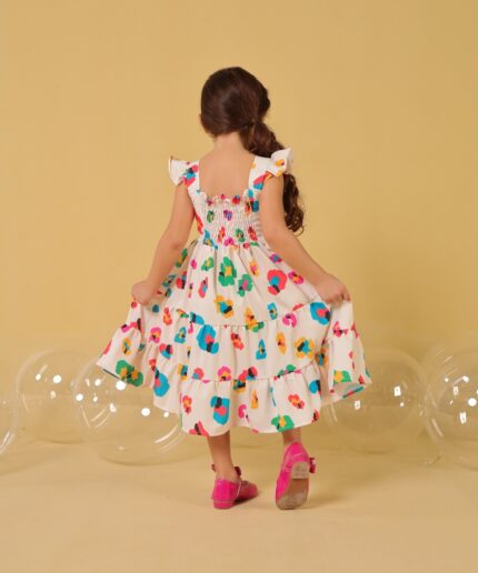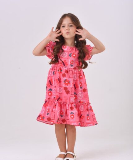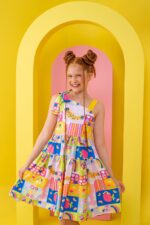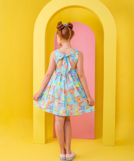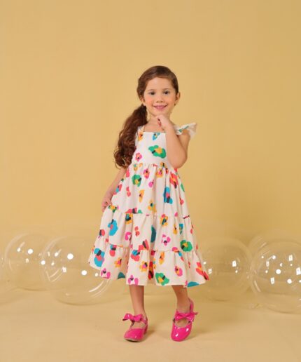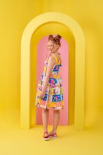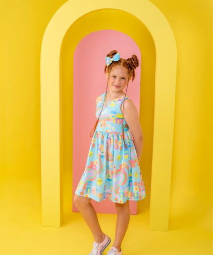 Vestido infantil com modelagem rodada e estampa lúdica em patchwork colorido, trazendo alegria e forte apelo visual para o público infantil.