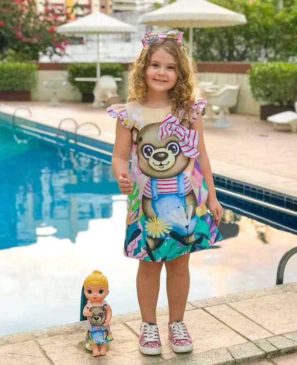 Vestido infantil confeccionado em crepe com toque de seda, trazendo leveza, conforto e um caimento delicado.