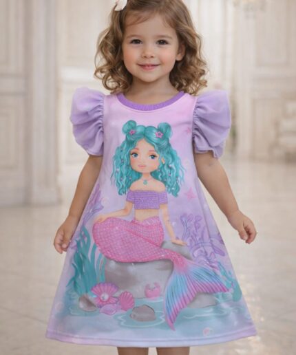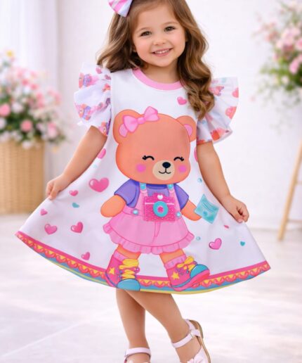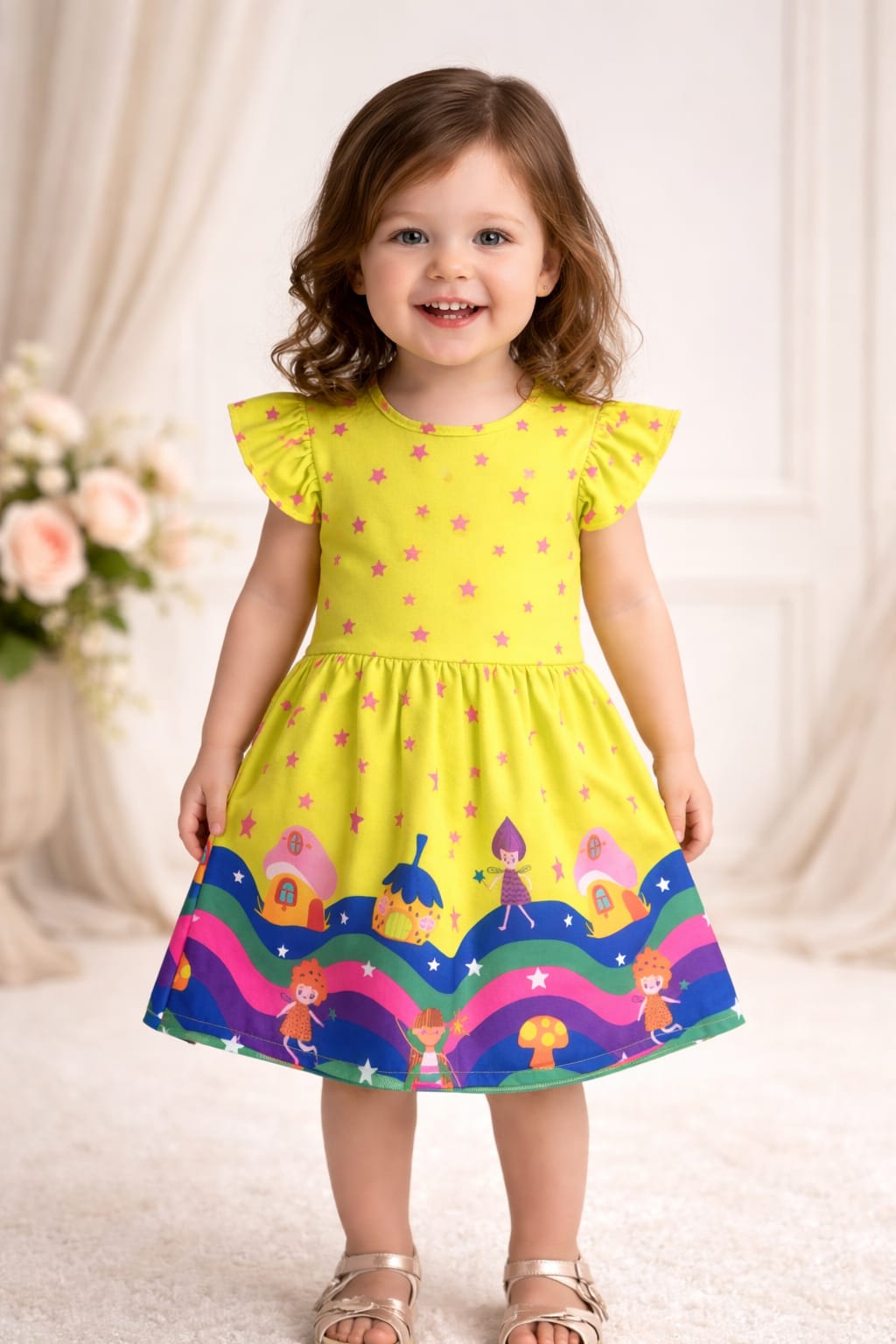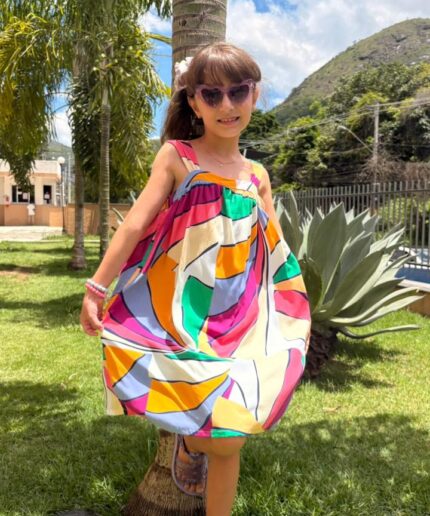 Vestido infantil confeccionado em crepe twill, com estampa digital de cores vivas e vibrantes, tecido leve e confortável, ideal para o dia a dia das pequenas.