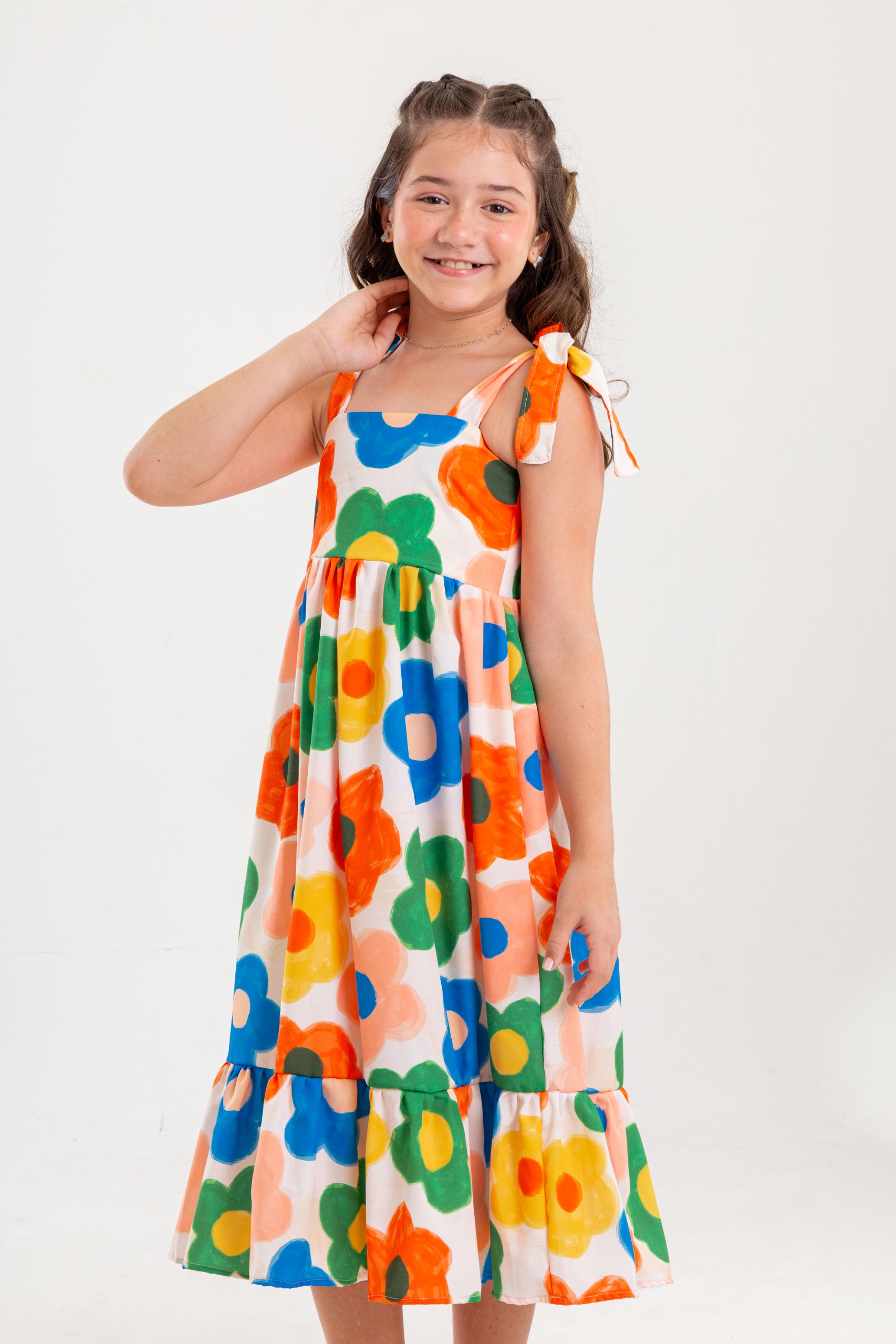 O modelo possui alças com ajuste de altura, permitindo melhor adaptação ao corpo da criança. A saia tem modelagem rodada, trazendo movimento e delicadeza ao look, finalizada com barrado largo na barra, que valoriza ainda mais o caimento da peça.