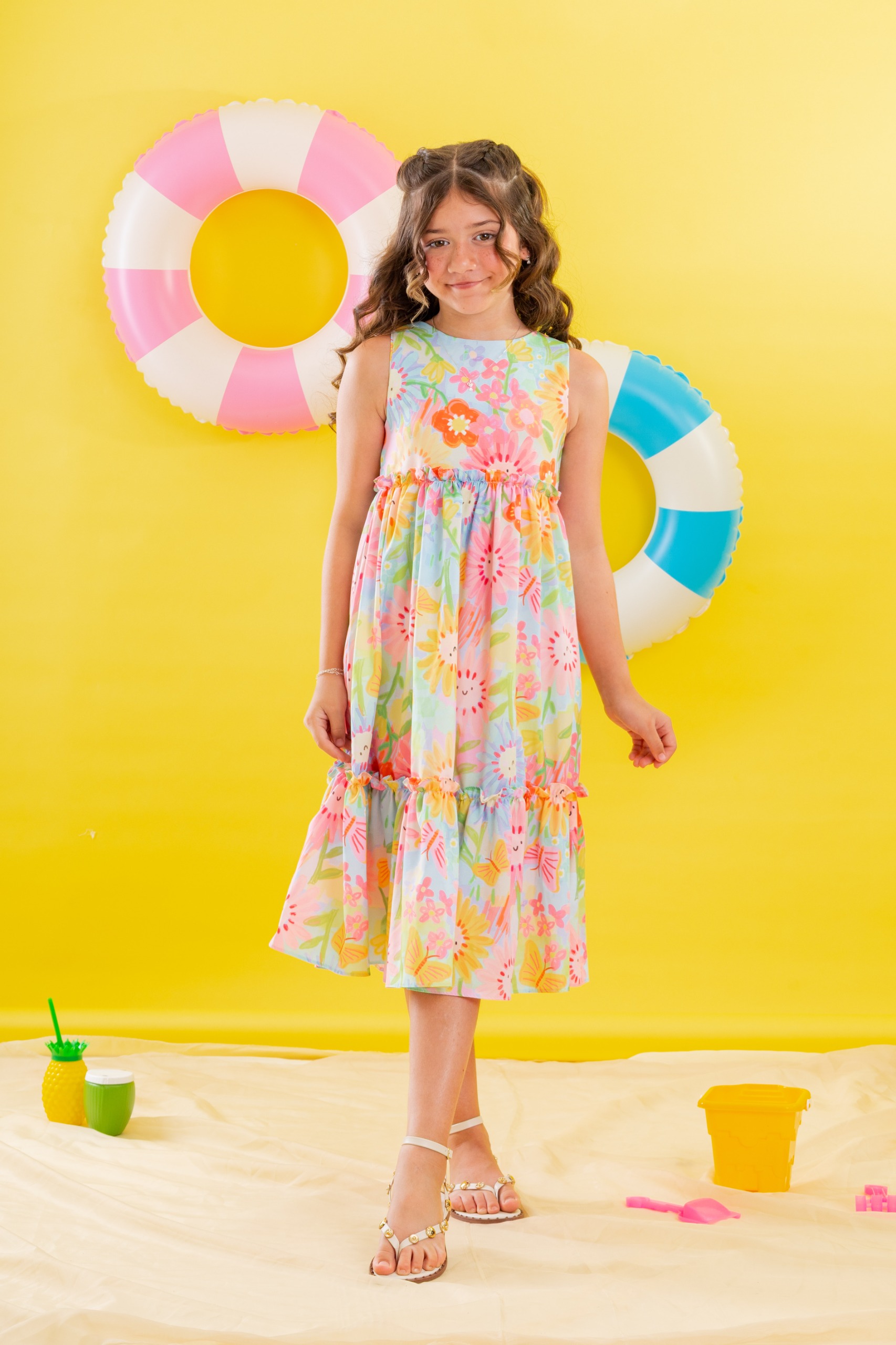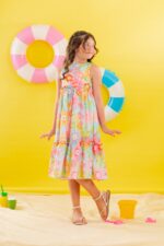 Vestido infantil confeccionado em crepe alfaiataria com toque de seda, tecido leve, estruturado e confortável, com estampa digital de cores vivas e vibrantes.