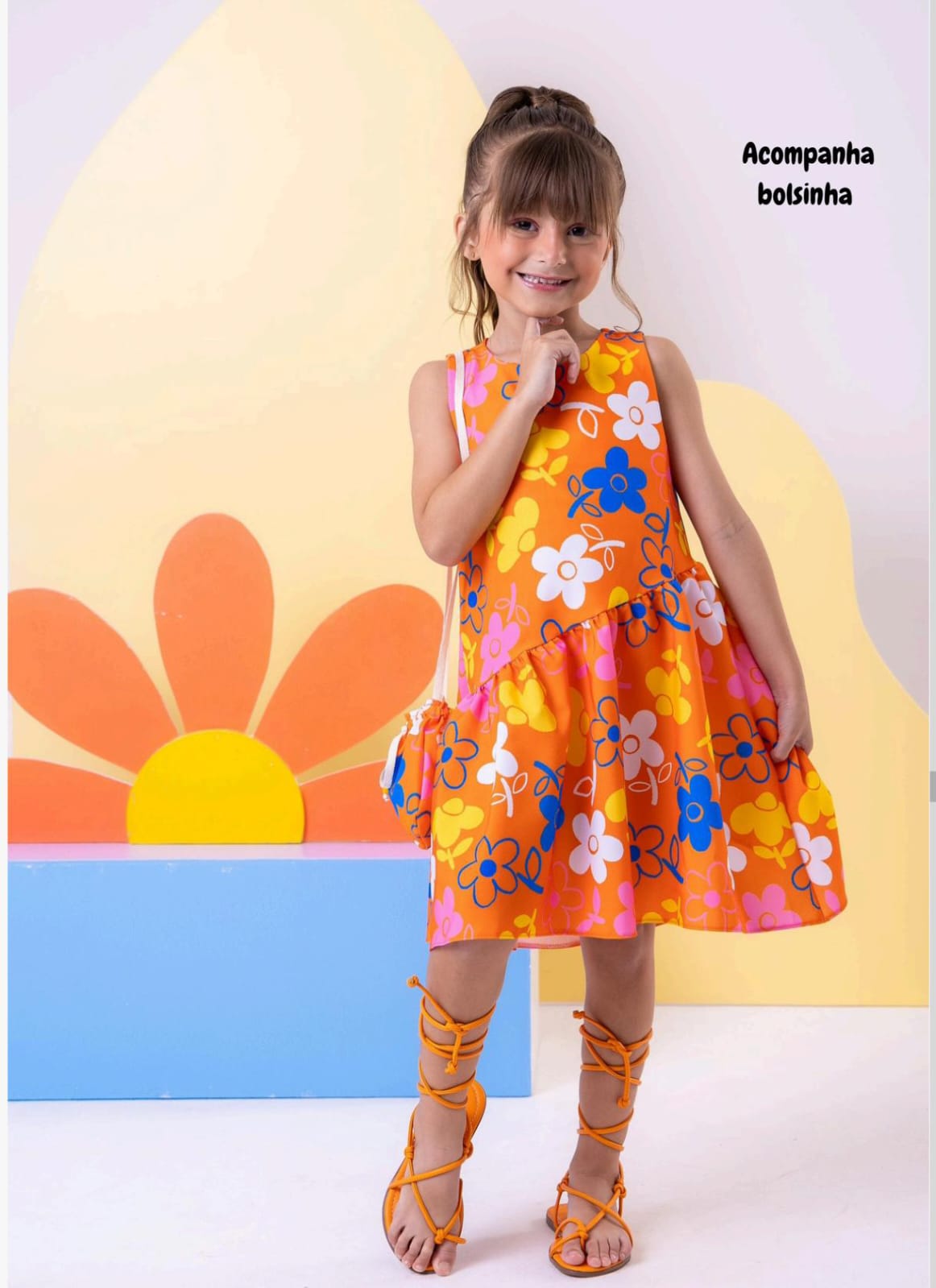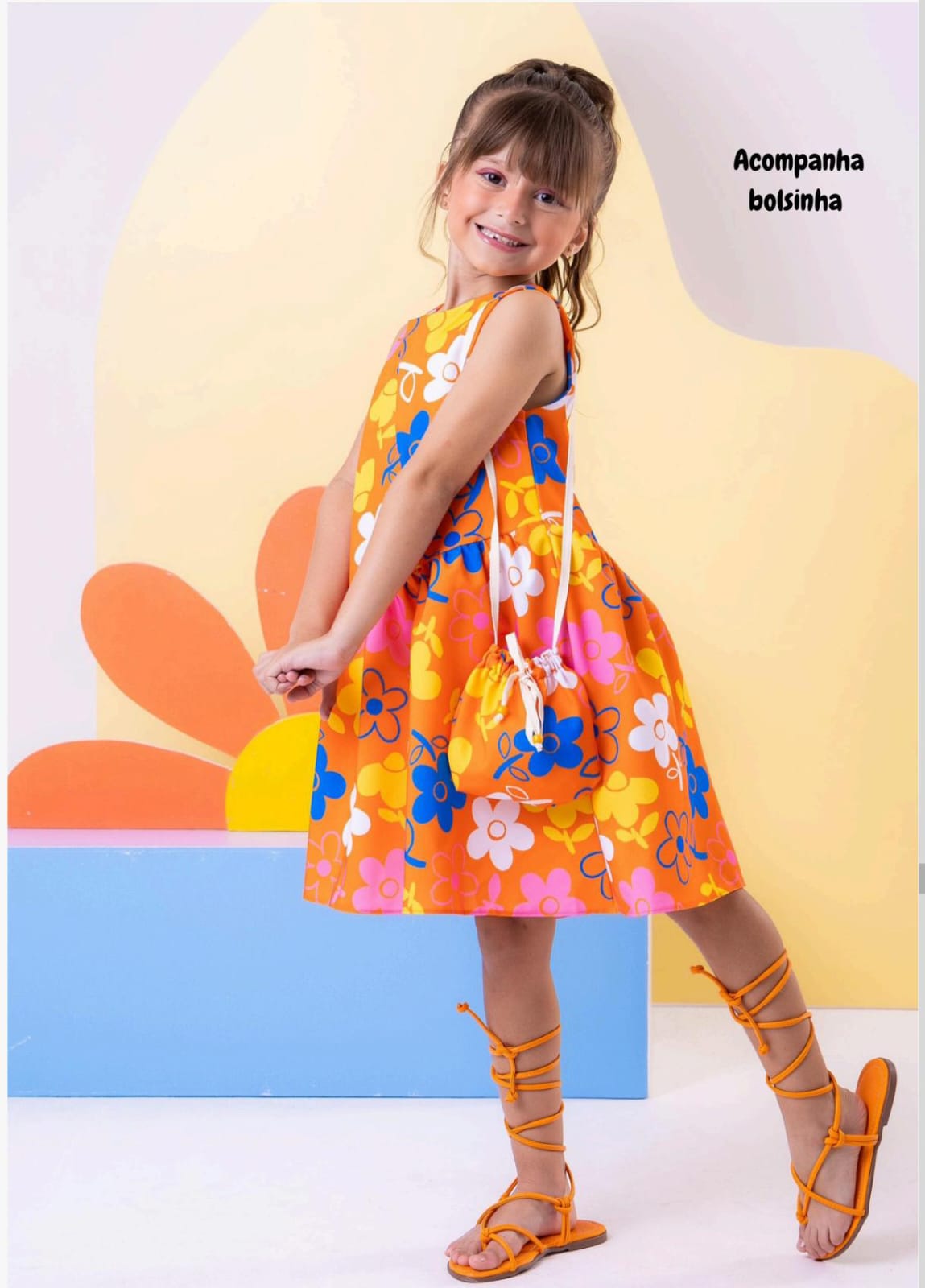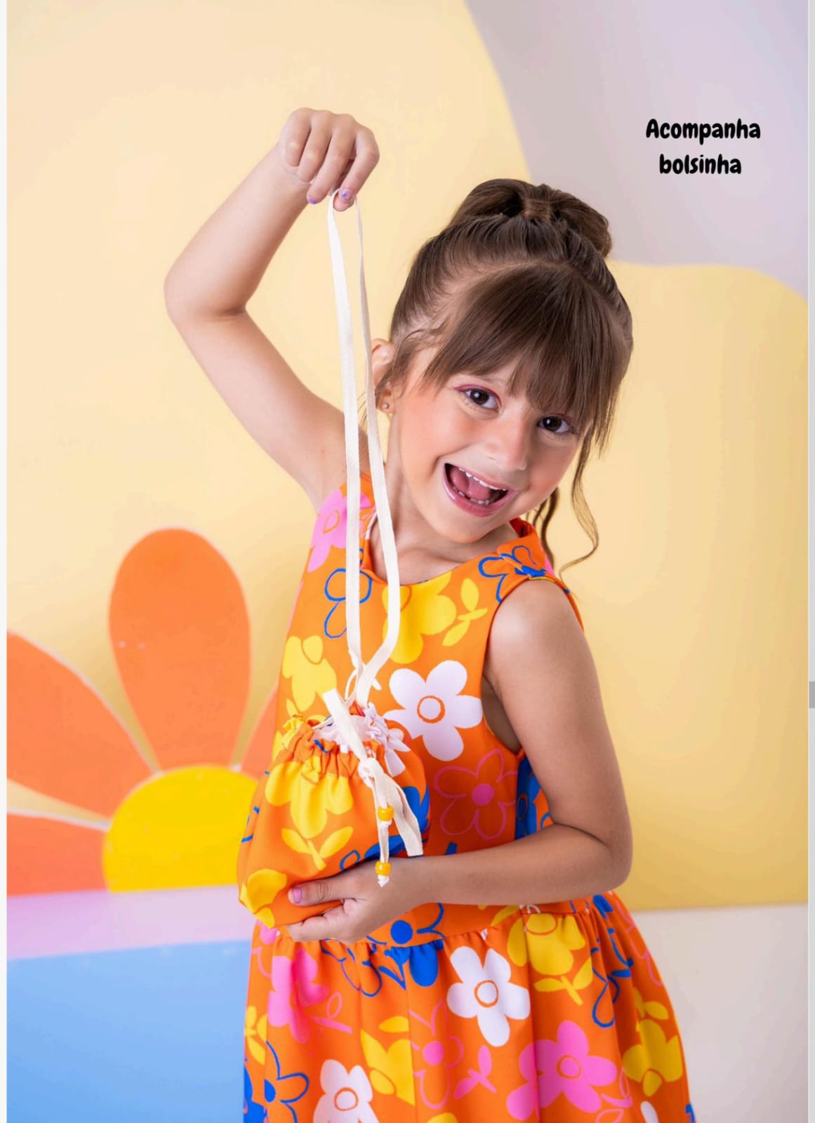 Para completar o look, acompanha uma charmosa bolsinha na mesma estampa do vestido, deixando a produção ainda mais estilosa e divertida.