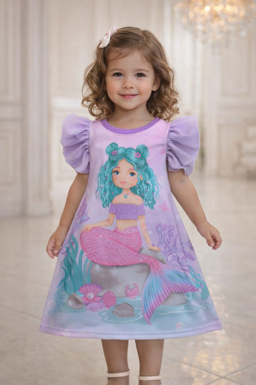 Possui estampa digital alegre e delicada, com cores suaves e personagens que deixam o look ainda mais lúdico.