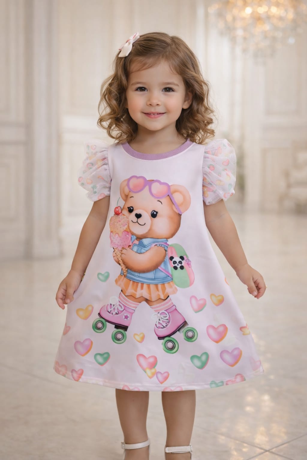 Possui estampa digital alegre e delicada, com cores suaves e personagens que deixam o look ainda mais lúdico.