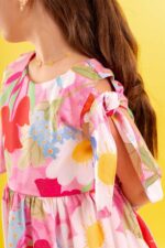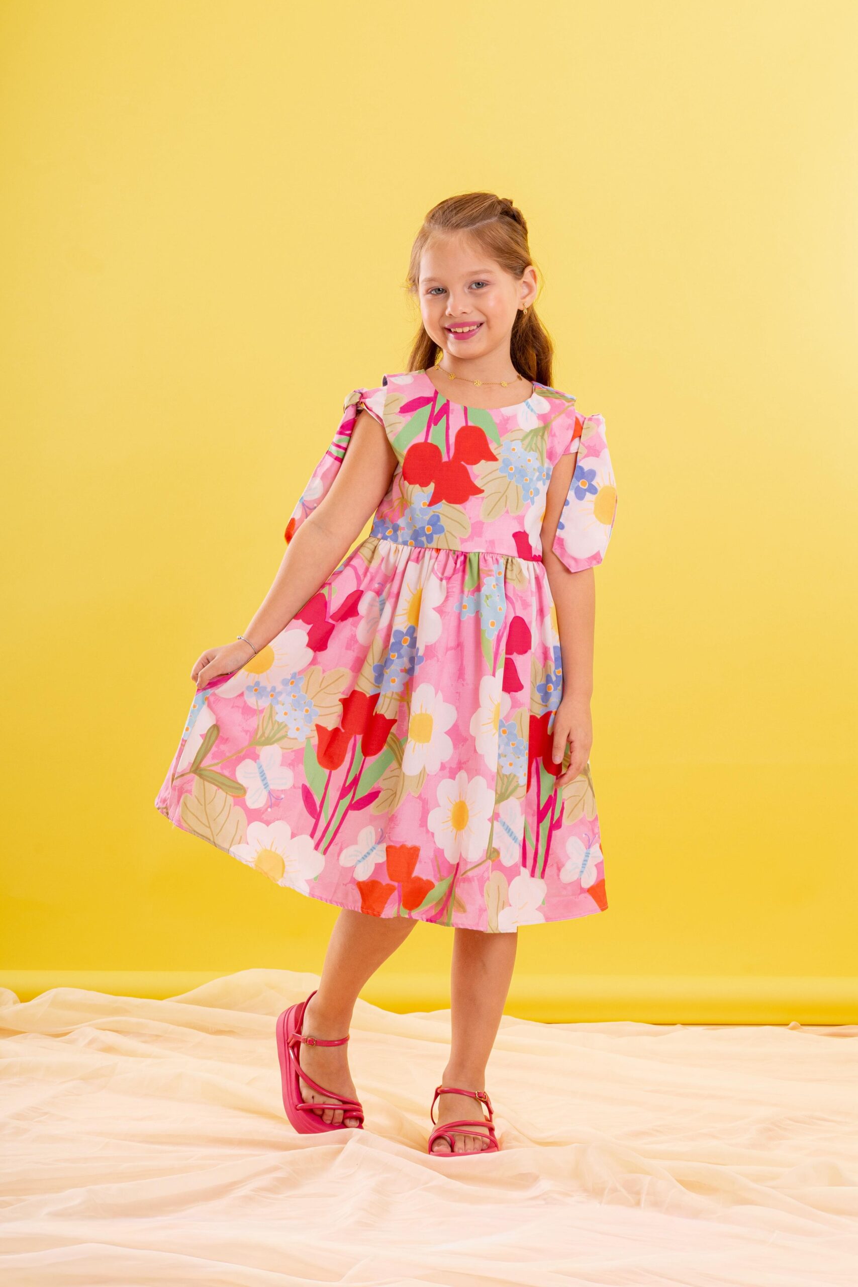 Vestido infantil confeccionado em crepe alfaiataria com toque de seda, tecido leve e estruturado, com estampa digital de cores vivas e vibrantes, que valorizam ainda mais o modelo.