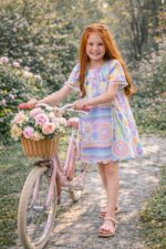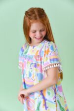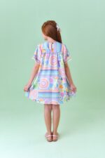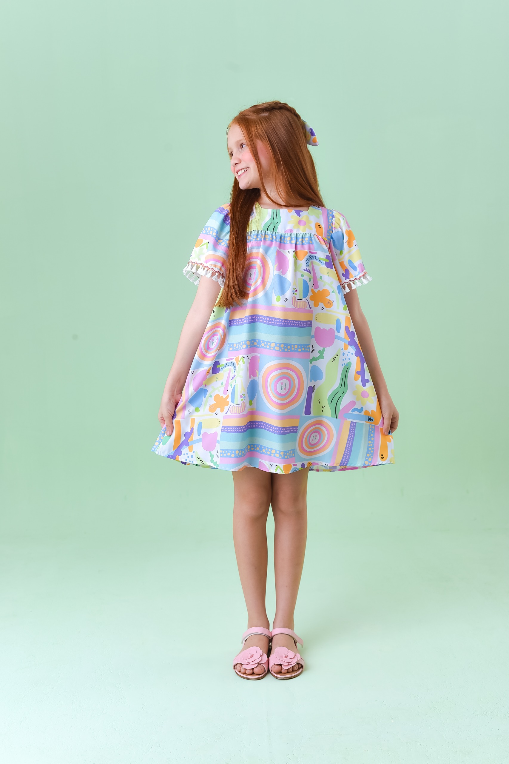 Vestido infantil com modelagem rodada e estampa lúdica em patchwork colorido, trazendo alegria e forte apelo visual para o público infantil.