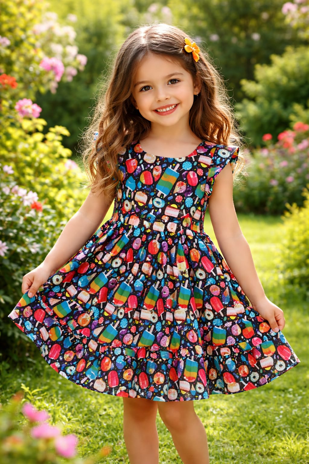 Vestido infantil com modelagem rodada e estampa lúdica em patchwork colorido, trazendo alegria e forte apelo visual para o público infantil.